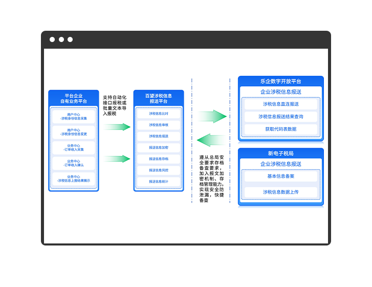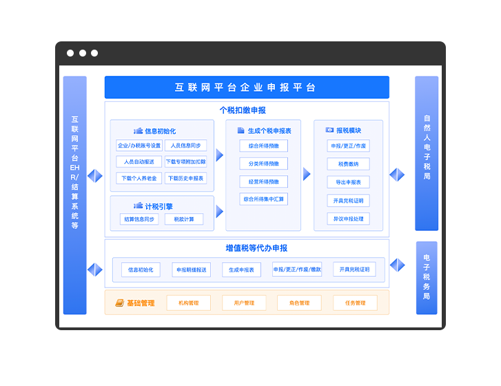我们为企业提供符合互联网涉税信息报送及申报解决方案,连接电子税局与乐企平台,助力平台企业完成涉税信息合规报送,并助力为从业人员办理扣缴申报、代办申报,支持云化部署与本地部署,有效解决报送难题和错报漏报风险,助力企业轻松应对监管要求。